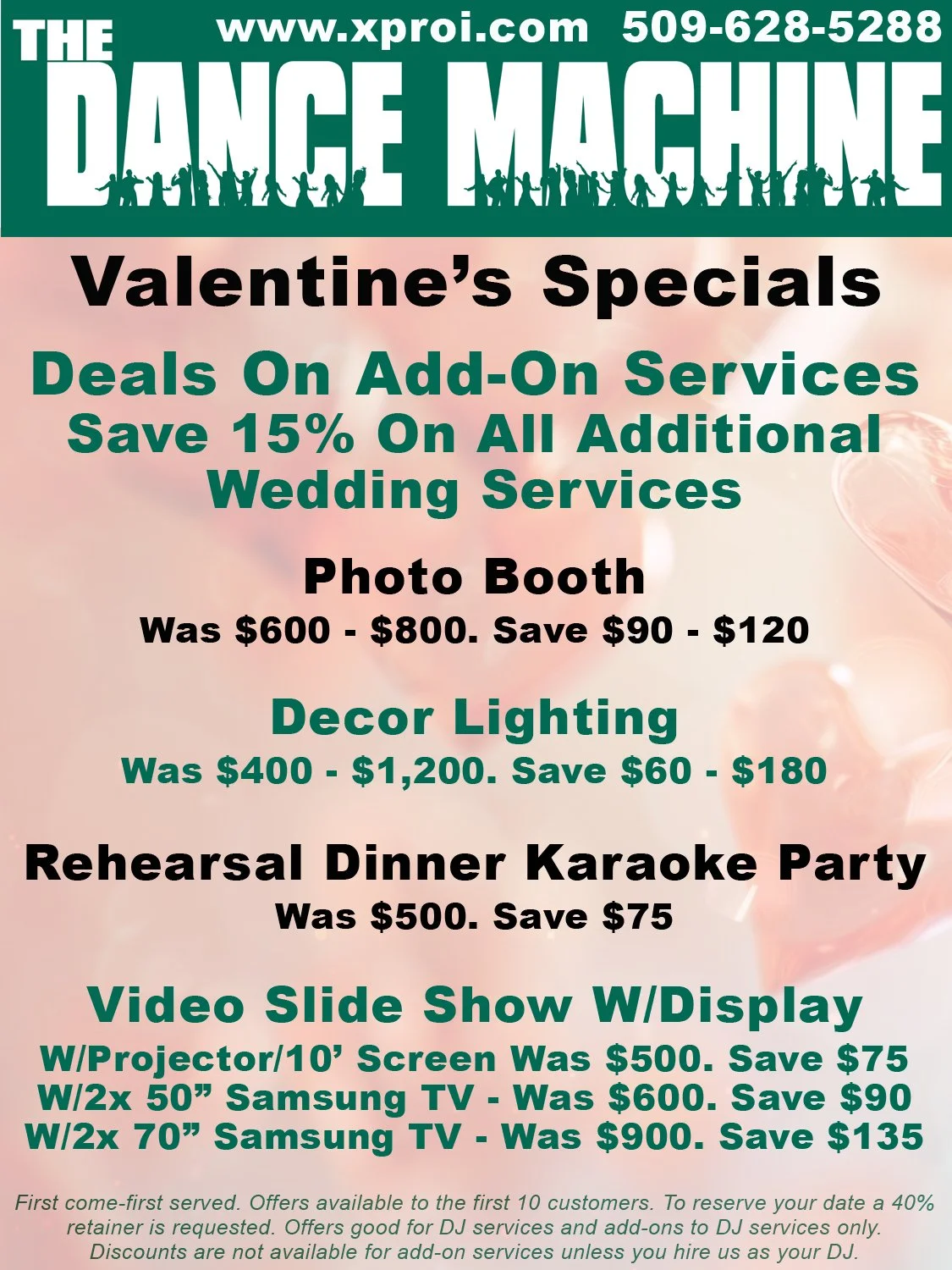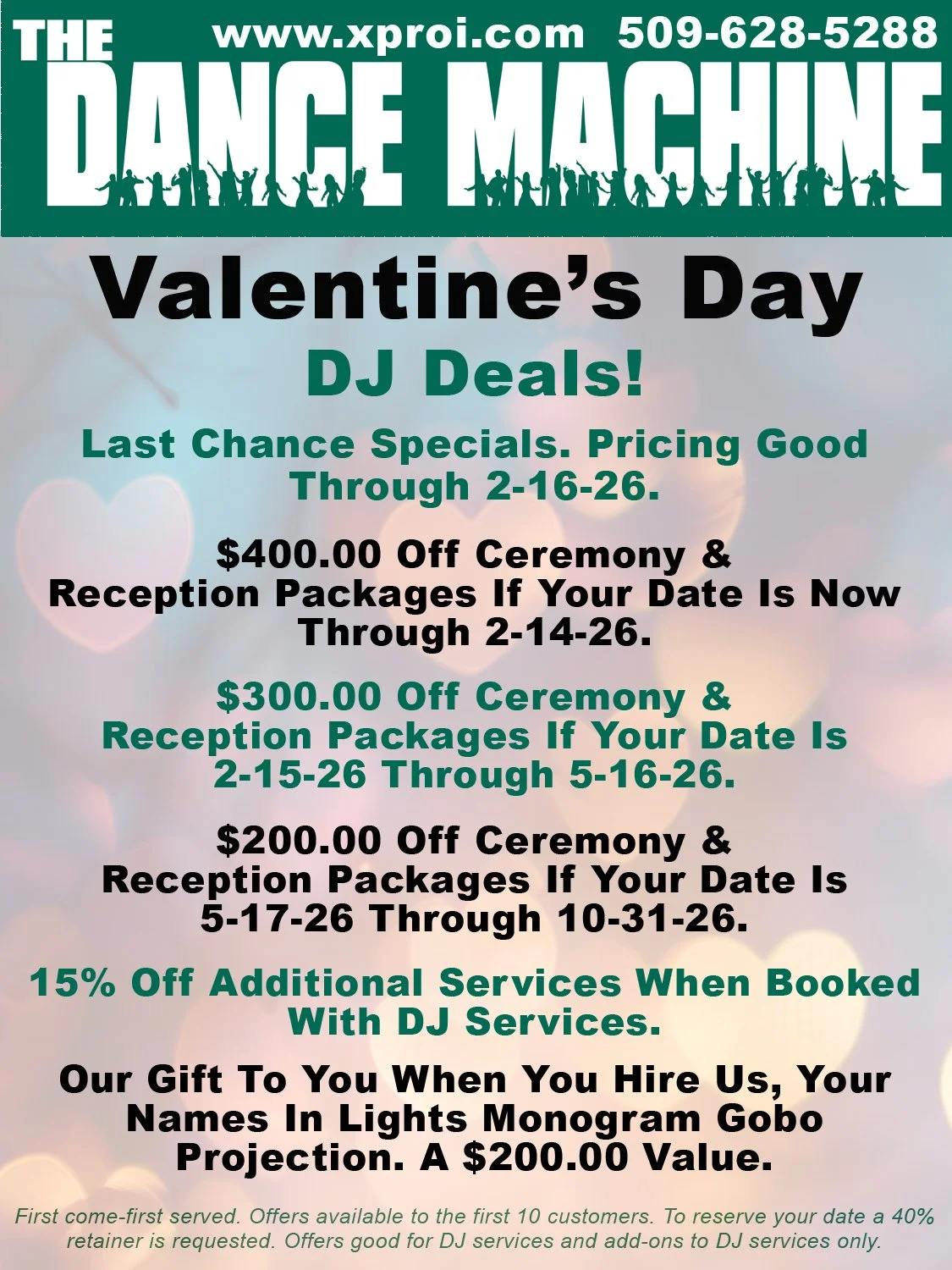 These deals are available for the first 10 customers only on a first-come, first-served basis. If you or anyone you know needs a DJ for their wedding this year or next year either call 509-628-5288 or fill out and send the form at www.xproi.com/contact